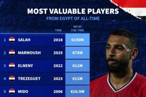 体育资讯10月13日讯德国转会市场列出埃及球员历史最高身价排名,萨拉赫1.5亿欧居首,马尔穆什7500万欧次席。埃及球员德转历史最高身价排名:萨拉赫(2018)——1.5亿欧马尔穆什(2025)——75