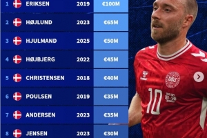 体育资讯10月13日讯德转统计了丹麦球员历史身价榜,埃里克森1亿欧位列第一。1.埃里克森2019年1亿欧2.霍伊伦2023年6500万欧3.尤尔曼2025年5000万欧4.霍伊别尔2022年4500万欧