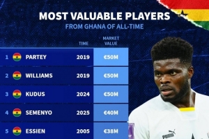体育资讯10月13日讯德国转会市场列出加纳球员历史最高身价排名,托马斯、伊纳基-威廉姆斯、库杜斯5000万欧居首。加纳球员德转历史最高身价排名:托马斯(2019)——5000万欧伊纳基-威廉姆斯(201