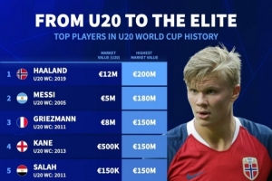体育资讯9月25日讯9月27日至10月19日,2025年U20世界杯将在智利举办。该项赛事向来都是足坛新星打出名声的舞台,“德转”统计了参加过U20世界杯、巅峰时期身价最高的10名球员。1.哈兰德(20