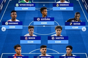 体育资讯10月12日讯德转列出巴西U21最贵阵,埃斯特旺6000万欧最高,罗克和恩德里克突前,萨维尼奥在列,全队总身价3.01亿欧。附巴西U21最贵阵容:门将:米卡埃尔(巴拉纳竞技,300万欧)后卫:雷