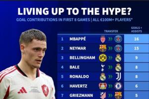 体育资讯10月03日讯今夏维尔茨一度以打破英超记录的转会费从勒沃库森加盟利物浦,但他新赛季的表现却不符预期。德转“恶趣味”地统计了转会费上亿欧元的攻击手们为新球队出战前8场比赛,在进球+助攻上的贡献榜单