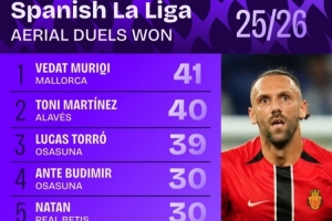 体育资讯10月7日讯日前,Squawka统计了本赛季西甲争顶成功次数排行,赫伊森21次位居第八。1、维达特-穆里奇(马洛卡):41次2、托尼-马丁内斯(阿拉维斯):40次3、卢卡斯-托罗(奥萨苏纳):3