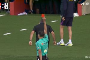 体育资讯10月19日讯北京时间22:15,西甲第9轮,巴萨2-1绝杀赫罗纳。比赛补时阶段,弗里克不满裁判,两黄变一红被罚下!