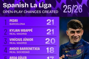 体育资讯10月16日讯日前,Squawka统计了本赛季西甲运动战创造机会排行,1、佩德里(巴萨):21次2、姆巴佩(皇马):21次3、维尼修斯(皇马):20次4、巴雷内切亚(皇家社会):18次5、居莱尔