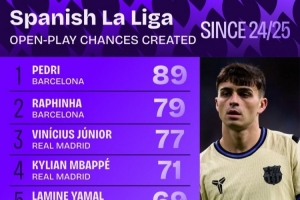 体育资讯10月16日讯日前,Squawka统计了西甲运动战创造机会次数排行,佩德里、拉菲尼亚前二,维尼修斯第三。1、佩德里(巴萨):89次2、拉菲尼亚(巴萨):79次3、维尼修斯(皇马):77次4、姆巴