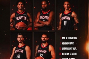 体育资讯10月15日讯NBA季前赛,火箭vs鹈鹕。本场火箭排出了一套“五大”首发:阿门、杜兰特、小史密斯、申京、亚当斯。5人身高分别为:阿门2米01、杜兰特2米11、小史密斯2米11、申京2米11、亚当