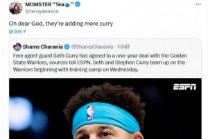 体育资讯10月01日讯据Shams报道,勇士用一年合同签下赛斯-库里。火箭队球员伊森的母亲转发相关报道,评论道:“我的天哪,他们加了更多的‘咖喱’(Curry)。”评论区的网友也附和道:“我在我最喜欢的