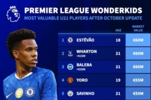 体育资讯10月18日讯德转在北京时间本月17日更新英超球员身价,同时列出了英超U21球员身价榜,埃斯特旺、亚当-沃顿、巴莱巴三人6000万欧身价最高。英超U21球员身价榜:1、埃斯特旺(切尔西,18岁)